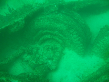 Der erste der der insgesamt 3 Tauchgänge führte uns zu einer vor ca. 30 Jahren gesunkenen Fähre die von einem Hurricane auf ein Korallenriff geschleudert wurde und von einem weiteren versenkt wurde. Leider ist die Fähre in ziemlich schlechtem Zustand, weshalb man nicht hineintauchen kann, aber sie LKW Fahrgestelle und Reifen die sich noch deutlich erkennen lassen sind sehr eindrucksvoll.