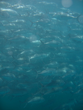 Bei unserem zweiten Tauchgang tauchten wir in der Mitte eines Fischschwarms auf, was uns etwas für das kalte Wasser und die Sicht entschädigte.