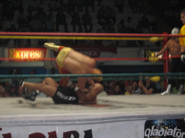 Neben knapp bekleideten Pausen-Girls bekamen wir einige sehr insziniert wirkende Kämpfe zu sehen, die aber trotz allem viel artistisches Können verlangen und obendrein noch gefährlich sind. Ein Kämpfer kugelte sich die Schulter aus und nachdem sein Teampartner sie notdürftig wieder eingekugelt hatte kämpte er (hauptsächlich mit dem anderen Arm) weiter.